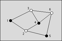 給你一個圖形,你的任務是找到一種最佳塗色的方法。圖形中的點要被塗顏色(只能塗黑色或白色),而且任何2個相連的點不可以都塗黑色。所謂最佳的塗色方法是指讓這個圖形黑色的點最多。以下圖形的塗色即是一種最佳塗色: