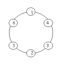 有一個環(ring)是由 n 個圈圈所組成的(在這裡 n 一定是個偶數),我們想要把 1 到 n 的自然數各放到一個圈圈中,使得相鄰 2 個圈圈中的數的和一定是質數。下圖為 n=6 的情形。